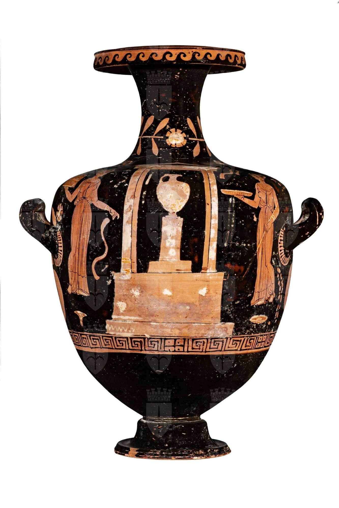 Kalpis apula a figure rosse con scena di offerta presso un tempietto: due donne in atto di offerta presso un tempietto al cui centro vi è, su un pilastro, un'hydria.