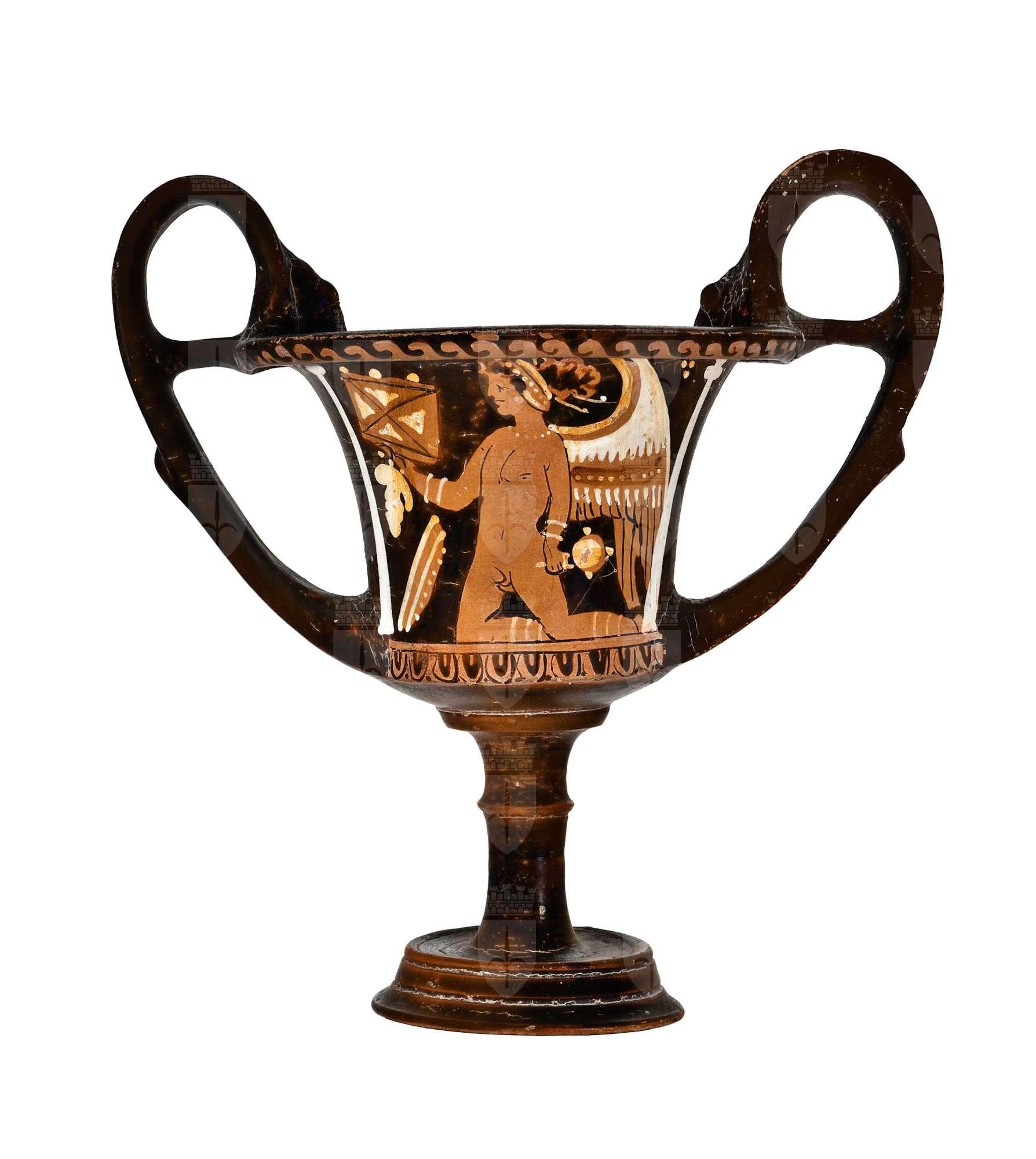 Kantharos apulo a figure rosse con elementi bianchi. Lato A: Eros nudo alato inginocchiato con kalathos, grappolo patera e specchio. Lato B: Eros simile con grappolo e specchio.