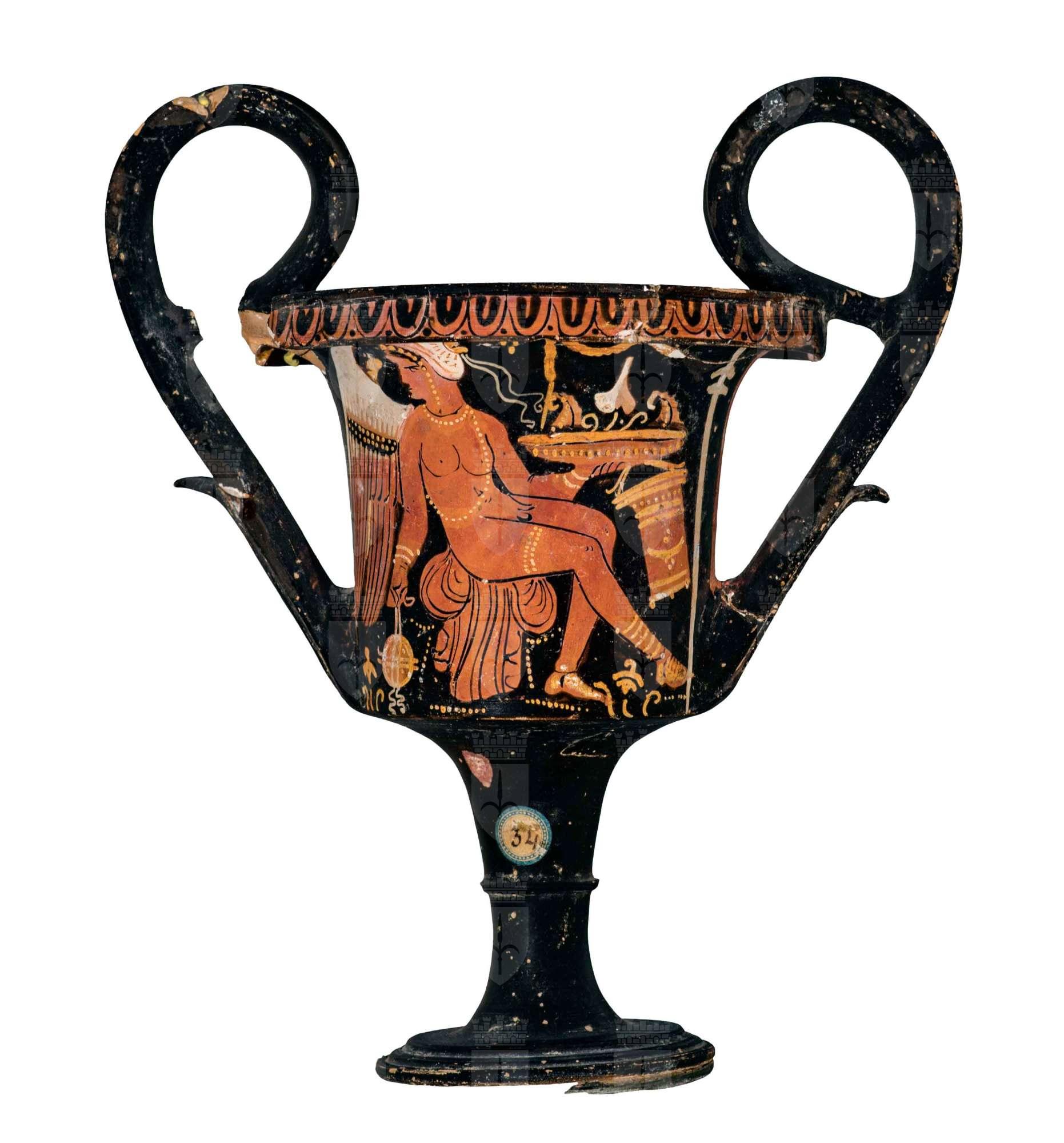Orlo svasato con labbro revoluto; bicchiere a profilo leggermente concavo; Lato A: erote seduto con phialè e situla tra due colonne Erote seduto su drappo di tre quarti verso destra e retrospiciente. Regge nella destra un piccolo tympanon pendente da nastri sovradipinti e decorato con doppia croce sovradipinta in bianco e giallo. Nella sinistra tiene una situla profilata in giallo con decorazioni lineari e puntinate sovradipinte; sempre nella s. patera profilata in giallo sovradipinto con corona di tratti centrale. Sulla patera, offerte vegetali: foglia d’edera nella metà s. sovradipinta in bianco tra coppia di foglie spiraliformi con linea mediana in nero e puntinata in giallo. Numerose decorazioni sovradipinte: porta i capelli raccolti in un sakkòs campito in bianco con nastri e decorazioni in giallo; sulla fronte fila di vaghi in giallo, pendente oltre l’orecchio. Le ali campite superiormente in bianco sono decorate nella parte inferiore da una fascia in nero con puntini in giallo e da una serie di linee diritte. Armillae ai polsi, collana a due file di vaghi circolari – uno girocollo, l'altro a tracolla e ricadente sul petto – e decorazioni sulle embades ai piedi, tutte in giallo sovradipinto. Ambientano la scena due sottili colonne sovradipinte in bianco. Nel campo, in alto, benda sovradipinta con nastro pendente in giallo; linea di terra puntinata in giallo con due fiori sovradipinti a tre petali e a campanula. Lato B: giovane seduto con cista tra due colonne Figura maschile di tre quarti verso destra, retrospiciente, seduto su drappo con pieghe in vernice nera diluita. Il giovane, nudo, porta sul capo una corona con nastri in giallo; allacciato al collo e ricadente dietro alle spalle, un petaso campito in giallo e, ai piedi, delle embades altrettanto sovradipinte. Nella mano destra regge una cista con offerte vegetali sulla sommità e decorata con sovradipinture su più registri, con motivi lineari, a meandri e a ߵsʼ;Nella sinistra tiene un piccolo tympanon pendente e decorato con doppia croce sovradipinta in bianco e puntini e con nastri sovradipinti all’estremità. Nella d. stringe il manico di una situla con decorazioni lineari e puntinate in giallo. In appoggio all’avambraccio d. tirso con fusto in bianco (in parte evanido) e con coronamento radiale. Linea di terra puntinata in giallo. Ambientano la scena due sottili colonne sovradipinte in bianco. Nel campo, in alto, in giallo sovradipinto piccola rosetta e infiorescenza a tre punti.
