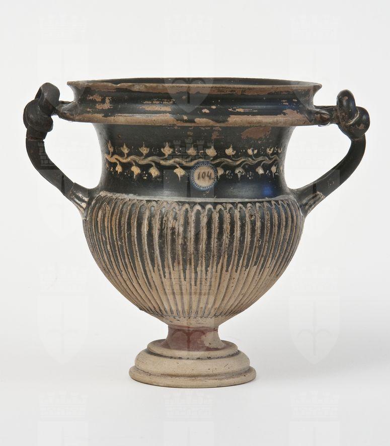 Kantharos a vernice nera con sovraddipinture in bianco e giallo. Spesso labbro revoluto, quasi bifido, orlo estroflesso, corpo a profilo concavo-convesso, strigilato, anse a nastro bifido, verticali, annodate all'estremità superiore, gola di raccordo, piede troncoconico cavo, sagomato all'esterno. Lato A e B: Sulla fascia liscia, sopra il corpo strigilato, tralcio di edera con stelo sinuoso dipinto e rosette di punti in giallo su base bianca. Le anse presentano alla base una fila di bastoncelli in giallo, pendenti da una linea orizzontale in bianco. Il piede è sovraddipinto con fila di punti, in bianco.