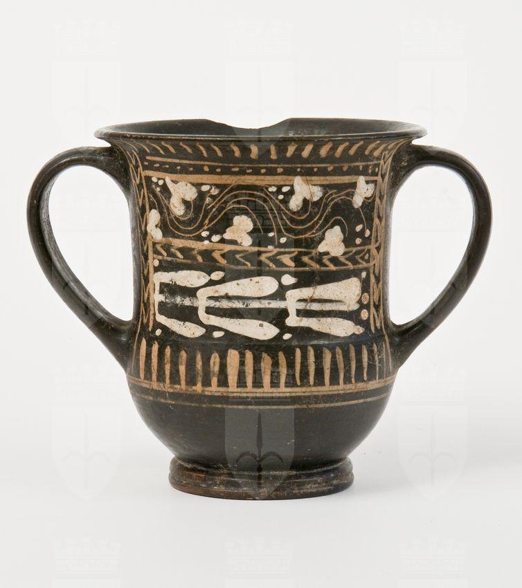 Kantharos sessile a vernice nera con sovraddipinture in bianco crema e giallo-arancio ed incisioni. Orlo estroflesso, collo a profilo concavo, corpo ovoidale, anse a nastro verticali, piede a tromba. Lato A: Lungo l'orlo fila di bastoncelli, seguiti da due linee dipinte, una più sottile in bianco, l'altra più spessa in giallo-arancio, che racchiudono una fila di punti. Sul collo, tralcio di edera con stelo sinuoso inciso e ramo di alloro con bacche, inquadrati lateralmente e divisi tra loro da Chevron, tra linee dipinte. Alla base del corpo bastoncelli in giallo-arancio e linea dipinta nello stesso colore. Lato B: stessa decolorazione, con ordine degli elementi vegetali invertiti: ramo di alloro con bacche, Chevron tra linee di tralcio di edera con stelo sinuoso inciso.
