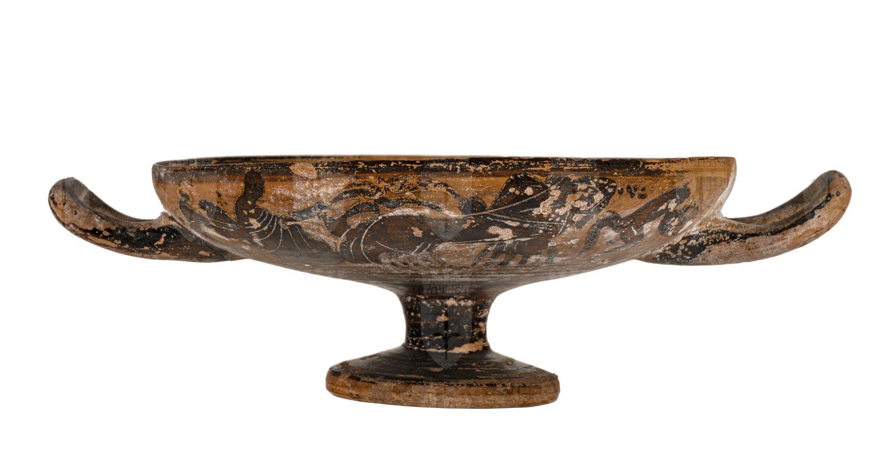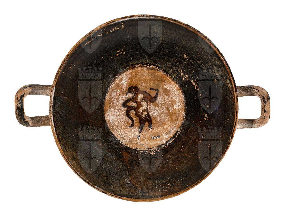 Kylix su basso stelo attica a figure nere. Su entrambi lati: un satiro stante che suona un timpano trattiene una donna a capo scoperto, Arianna, che sta per salire sul carro a due cavalli dei quali trattiene le redini; chiude la scena una analoga figura di satiro. All’interno, nel tondo centrale, una tipica figura di satiro danzante in posizione composta con la mano sinistra alzata.