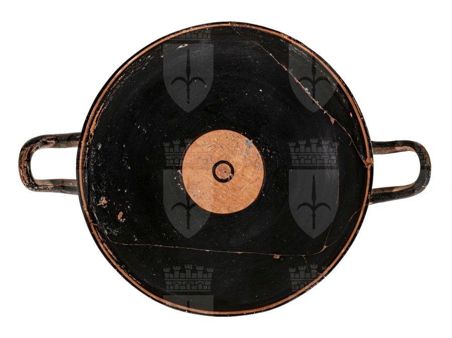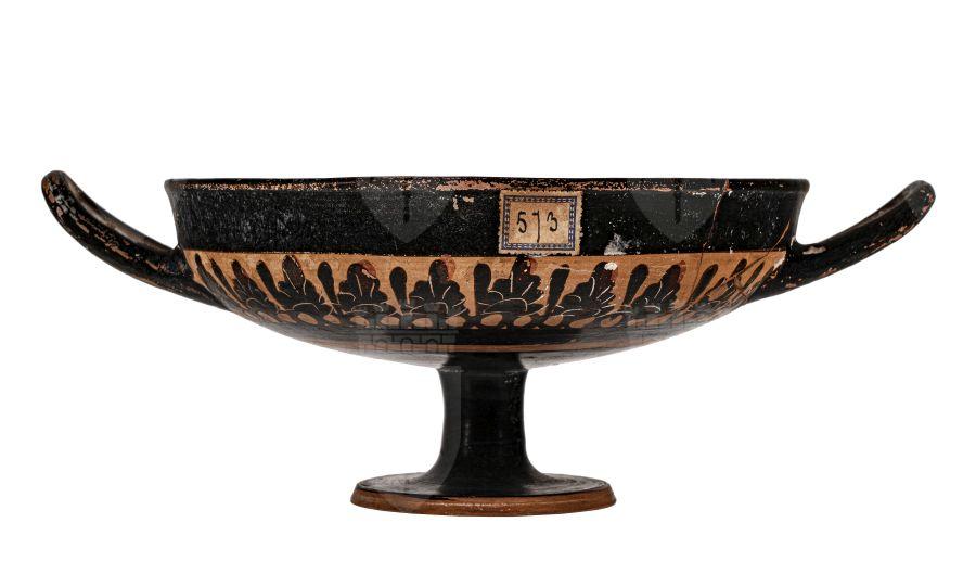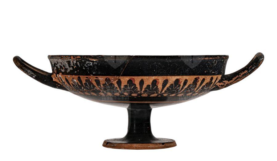 Kylix su basso piede attica a figure nere con tracce di colore rosse. Fascia di palmette.