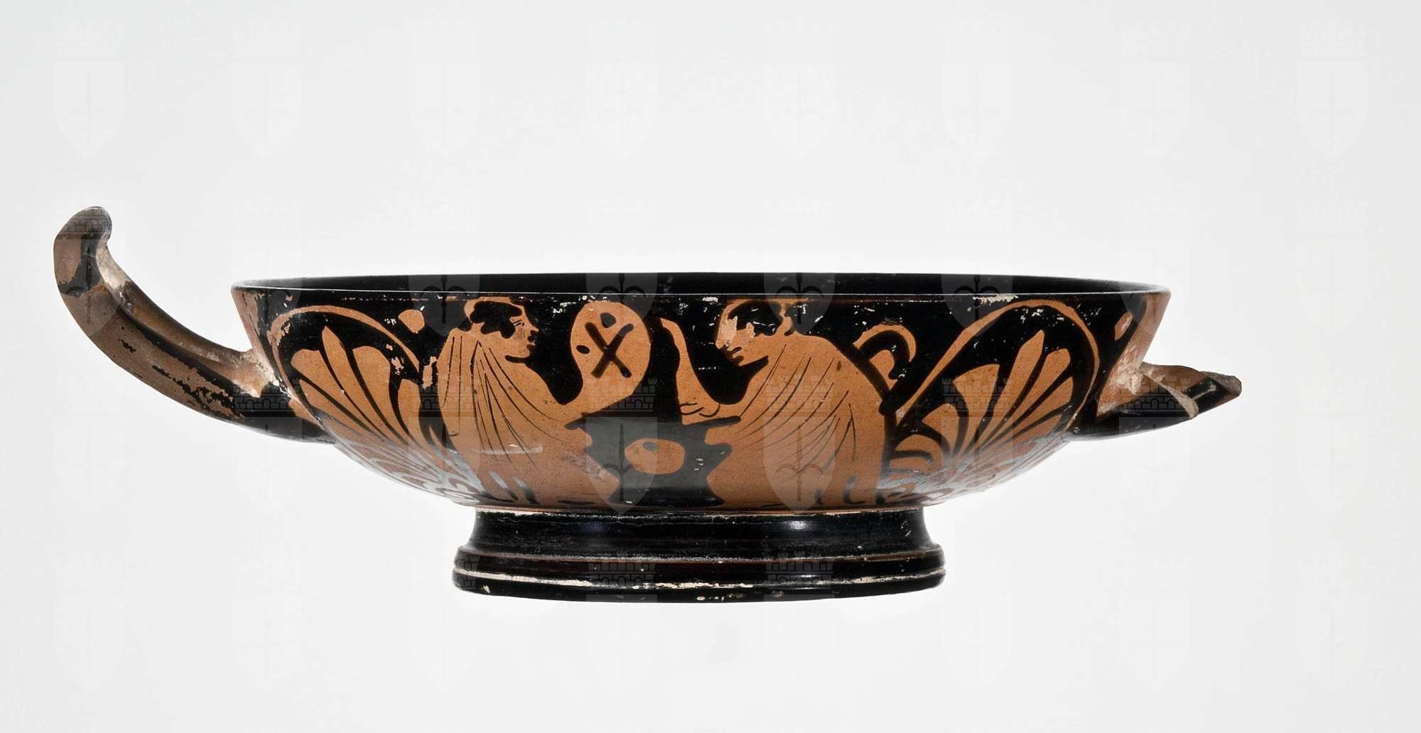 Coppa su stelo basso e largo attica a figure rosse. Lato A e B: due giovani con palla e strigile; interno: nel tondello Eros nudo in marcia con aryballos.