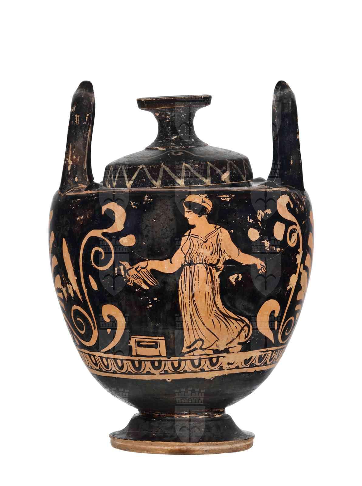Argilla rosata (7.5 YR 7/4 Munsell); la vernice è lucente, di buona qualità, generalmente ben conservata ma scalfita, diluita abrasa in alcuni punti, per cui le immagini sovraddipinte si rivelano di difficile lettura. Si rilevano, inoltre, alcune piccole zone che evidenziano problemi di cottura. Il vaso presenta un corpo globulare leggermente rastremato nella parte bassa, con un'imboccatura non molto larga, su cui si imposta un breve labbro verticale. Sulle spalle del vaso sono presenti, su entrambi i lati, due piccole protuberanze, che sembrano quasi delimitare l' area sottostante, destinata alla decorazione figurata. Il vaso presenta poi una vasca non molto profonda, con fondo arrotondato che poggia su un piede a campana, delimitato superiormente da una sottile modanatura, la quale si ripresenta anche sul bordo superiore dello spessore del piede. Il vaso presenta, impostate verticalmente sulla spalla, alte anse a bastoncello, sulla cui sommità sono presenti delle piccole protuberanze. Decorazione del lato A: è raffigurata una figura femminile con il volto di profilo e i piedi rivolti verso sinistra, e con il corpo e le gambe di prospetto; porta i capelli raccolti in un sakkos ed è vestita di un chitone smanicato ricco di drappeggi che, stretti alla vita, le segnano le linee del corpo. A sottolineare le pieghe della stoffa vi sono delle sottili bande più scure. La donna tiene il braccio sinistro sospeso elegantemente a mezz'aria, mentre tiene stretta nella mano destra una colomba. Ai suoi piedi, sulla sinistra, è raffigurata una piccola cassetta. Decorazione del lato B: la scena mostra un giovane nudo, con il volto di profilo verso sinistra e con il corpo e le gambe di prospetto, che porta i capelli corti, con una ciocca che gli ricade all'altezza degli zigomi. L'unico indumento è il mantello, portato sulla spalla e sul braccio sinistri per poi ricadere lungo il fianco, i cui drappeggi sono sottolineati lungo il bordo inferiore da una banda più scura. Nella mano destra il giovane regge un bastone a metà altezza. La decorazione accessoria è costituita da due palmette tra girali fogliati, che riempiono lo spazio sotto le anse. Un sottile filetto risparmiato corre lungo la linea ideale tra le due protuberanze sulla spalla; alla base delle scene figurate, sotto un ulteriore filetto risparmiato che funge quasi da linea di appoggio per le figure principali delle scene, corre lungo tutta la circonferenza del vaso una fascia decorata dalla sequenza ovulo-guscio e puntino, sottolineata da un'altra spessa linea risparmiata. Un sottile filetto graffito decora il punto di stacco tra ventre e piede. Il coperchio è in argilla rosata (7.5 YR 7/4 Munsell) e presenta un foro rotondo sull'estremità superiore della presa cilindrica, staccata dal coperchio per mezzo di una modanatura sottilissima sottolineata da un filetto graffito. Vi è una seconda modanatura sottilissima proprio nel punto di attacco tra il corto stelo della presa ed il coperchio. È presente, attorno al foro sulla presa, una decorazione a linee radiali, mentre la base del coperchio è ornata con una linea continua a zig zag, che corre lungo tutta la circonferenza.