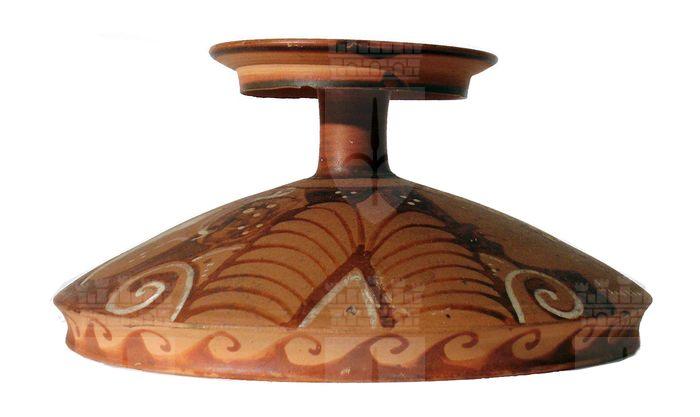 Lekanis a figure rosse con decorazione a fascia di linee verticali sulla coppa e due teste femminili con mitella tra palmette sul coperchio.