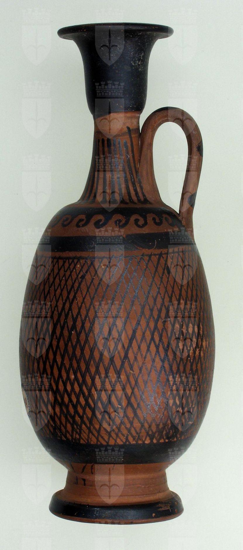 Lekythos apula con decorazione a reticolato nero e onda corrente sul collo.
