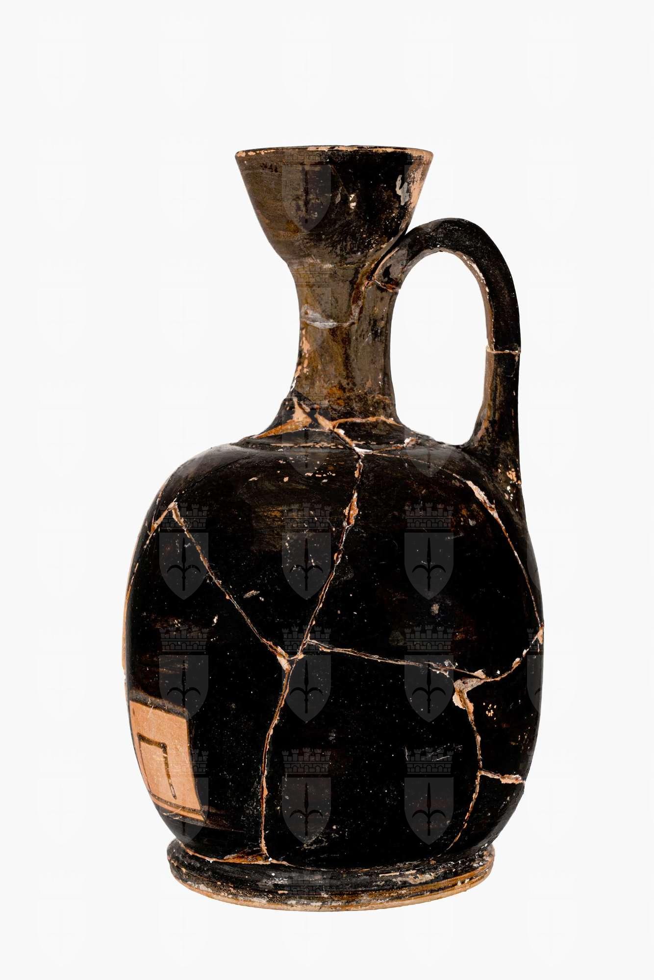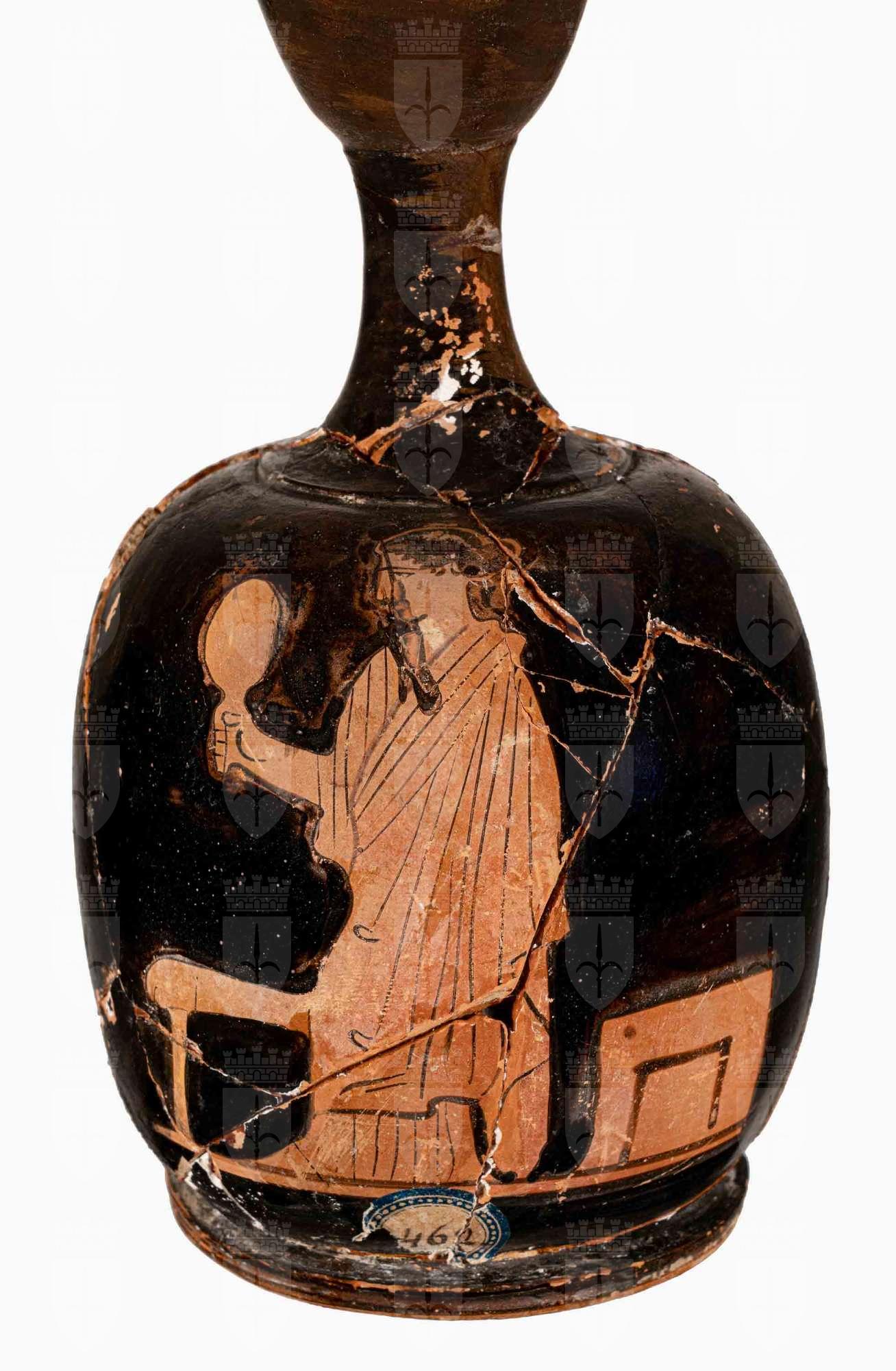 Lekythos attica a figure rosse con imboccatura troncoconica e corpo ovoidale. Donna stante con specchio. A destra, una pyxis chiusa, a sinistra un sedile a cuscino.