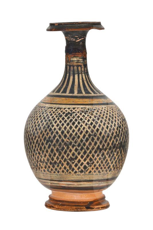 Bombylios o unguentario a bottiglia a vernice nera lucente con sovraddipinture in bianco crema e giallo. Stretto e basso collo, corpo globulare espanso superiormente e rastremato verso il basso, bassa gola di raccordo, piede troncoconico con taglio modanato. Una sottile linea dipinta in bianco crema cinge la parte più stretta del collo, seguita da bastoncelli racchiusi superiormente e inferiormente da due linee, sempre in bianco crema. Sulla spalla fascia dipinta in giallo su base bianca, sul corpo motivo con reticolo a maglia romboidale sovraddipinto in bianco e inquadrato da due linee bianche.