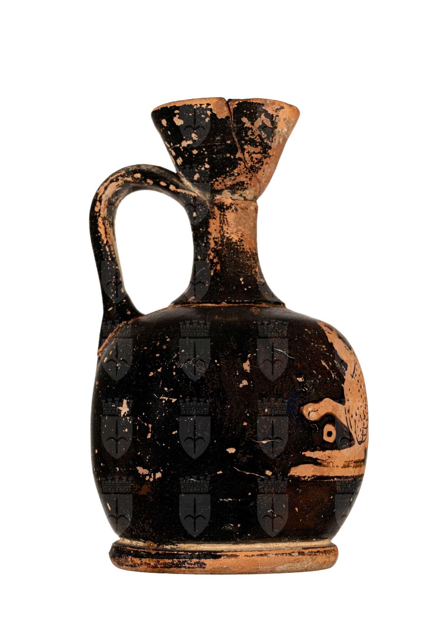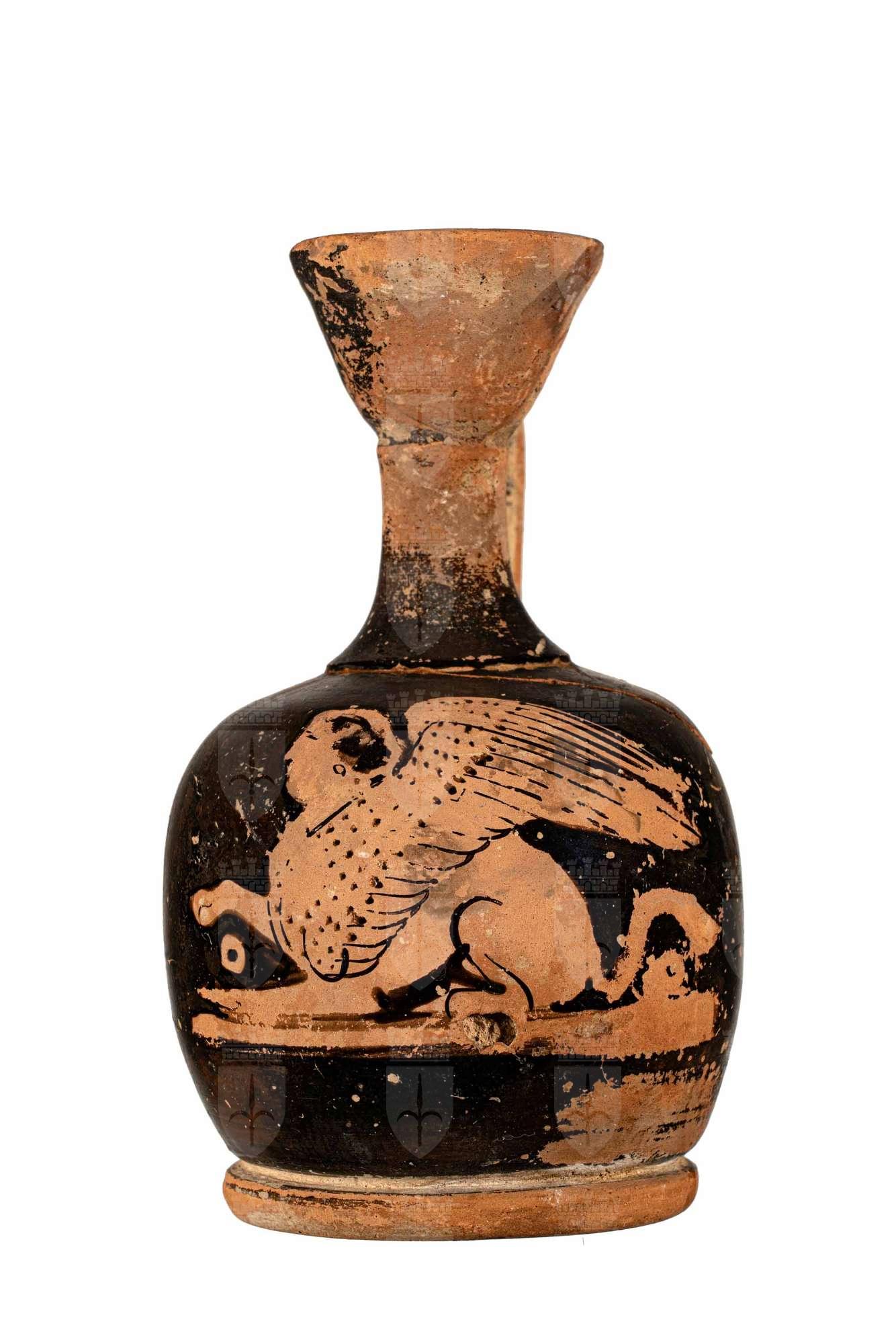 Lekythos attica a ventre globulare fortemente espanso a figure rosse: sfinge alata accucciata.