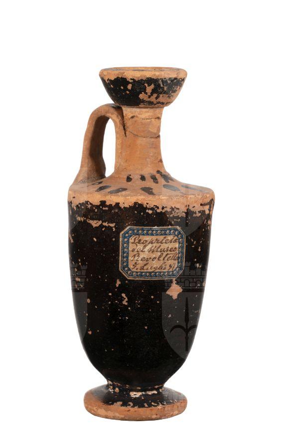 Lekytos attica a figure nere con motivo a raggiera e fiori di loto stilizzati sul collo; decorazione parzialmente abrasa.