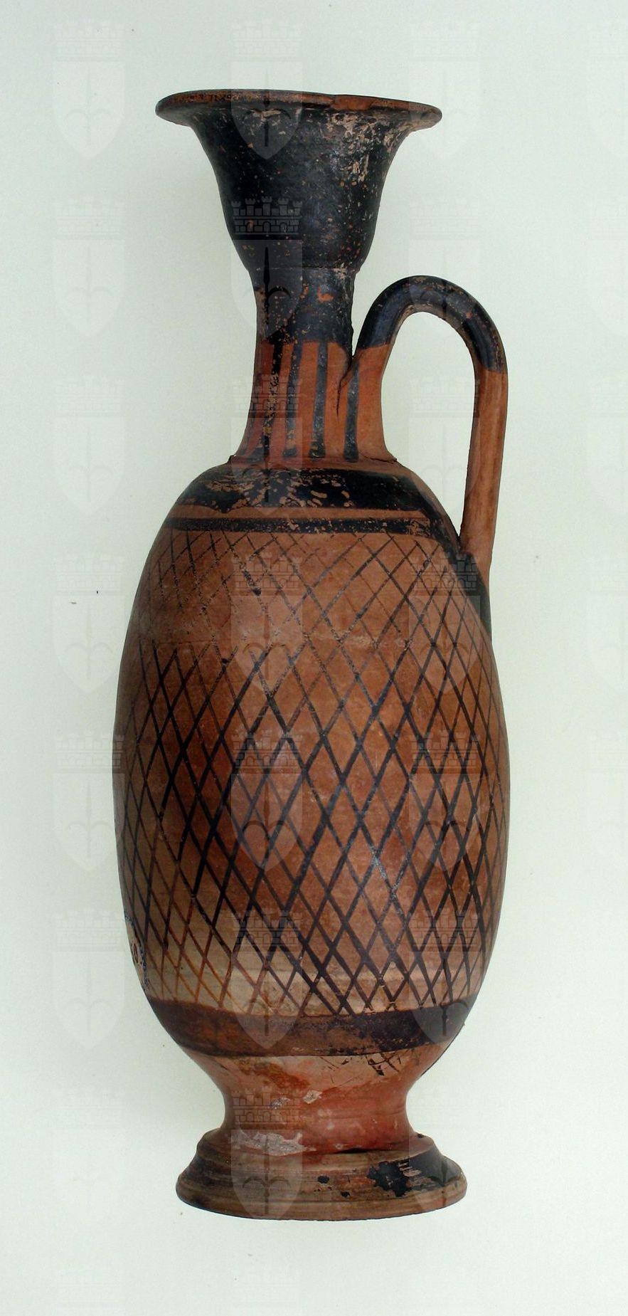 Lekythos apula con decorazione a reticolo a vernice nero.