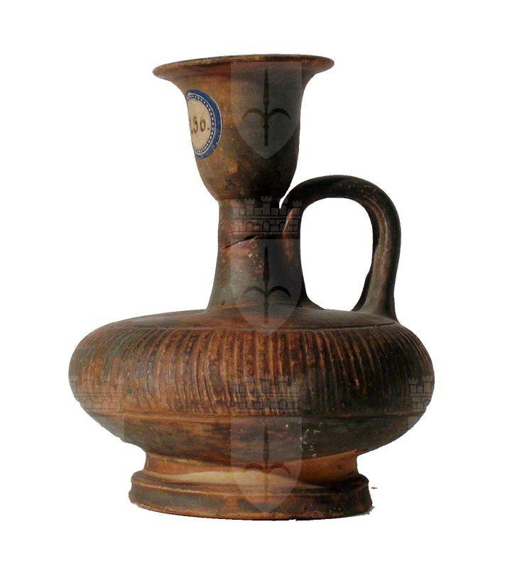 lekythos in argilla rosa con imboccatura campaniforme, collo stretto a lati concavi, corpo molto espanso e schiacciato con piede modanato, ansa verticale a nastro. Baccellatura sul ventre, vernice bruna priva di sovraddipinture