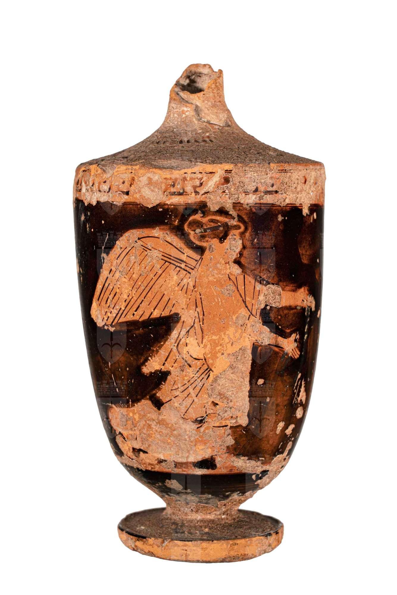 Lekythos attica a figure rosse con immagine di donna (?) in lunga veste e alata in marcia verso sinistra a braccia tese; fascia a meandro nero all'attacco della spalla, false baccellature in nero sulla spalla (assai poco leggibili).