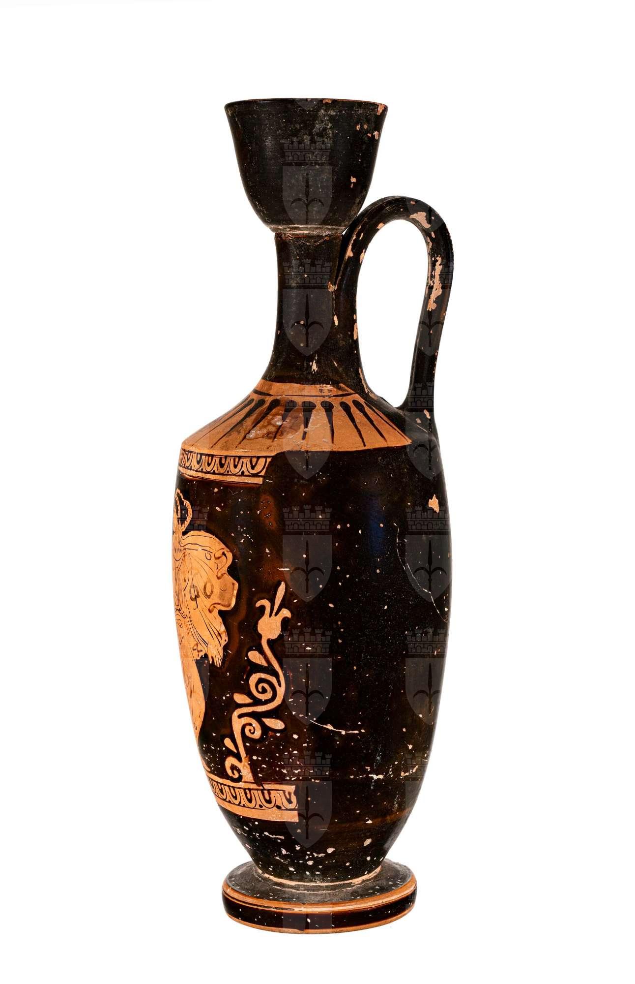Lekythos attica a figure rosse con immagine di donna con chitone e himation svolazzante, seno in rilievo, in fuga verso destra, volge il capo all'indietro.