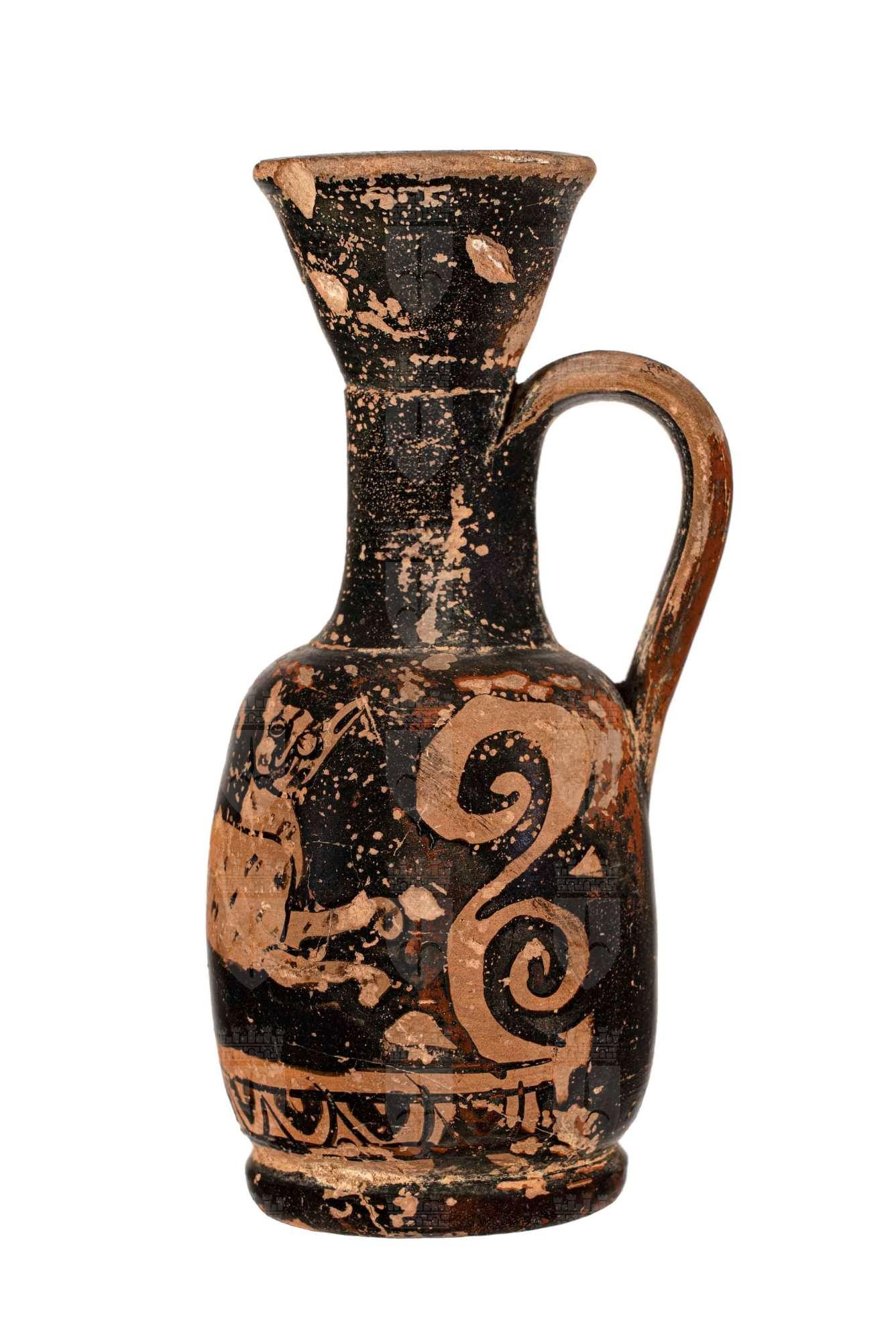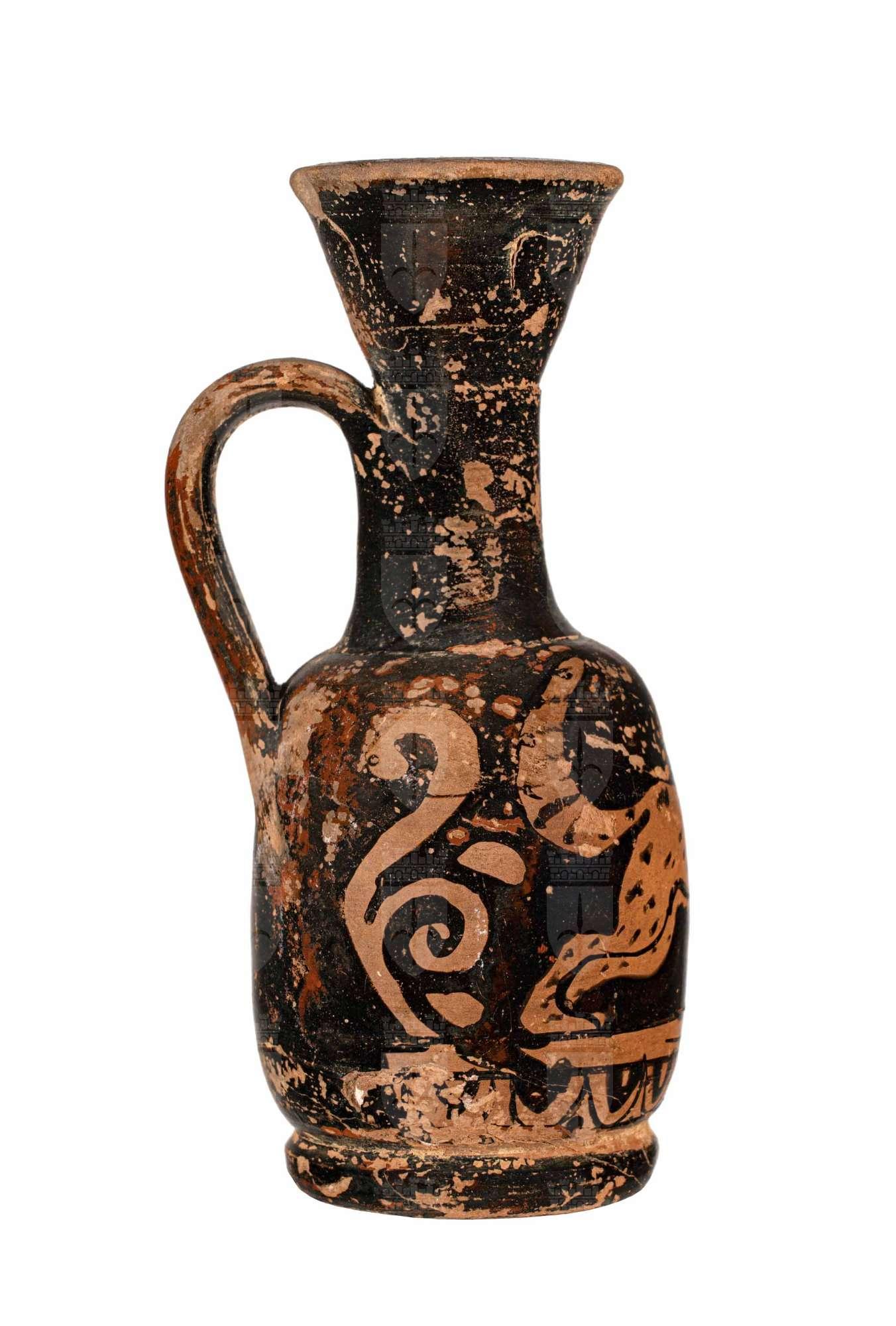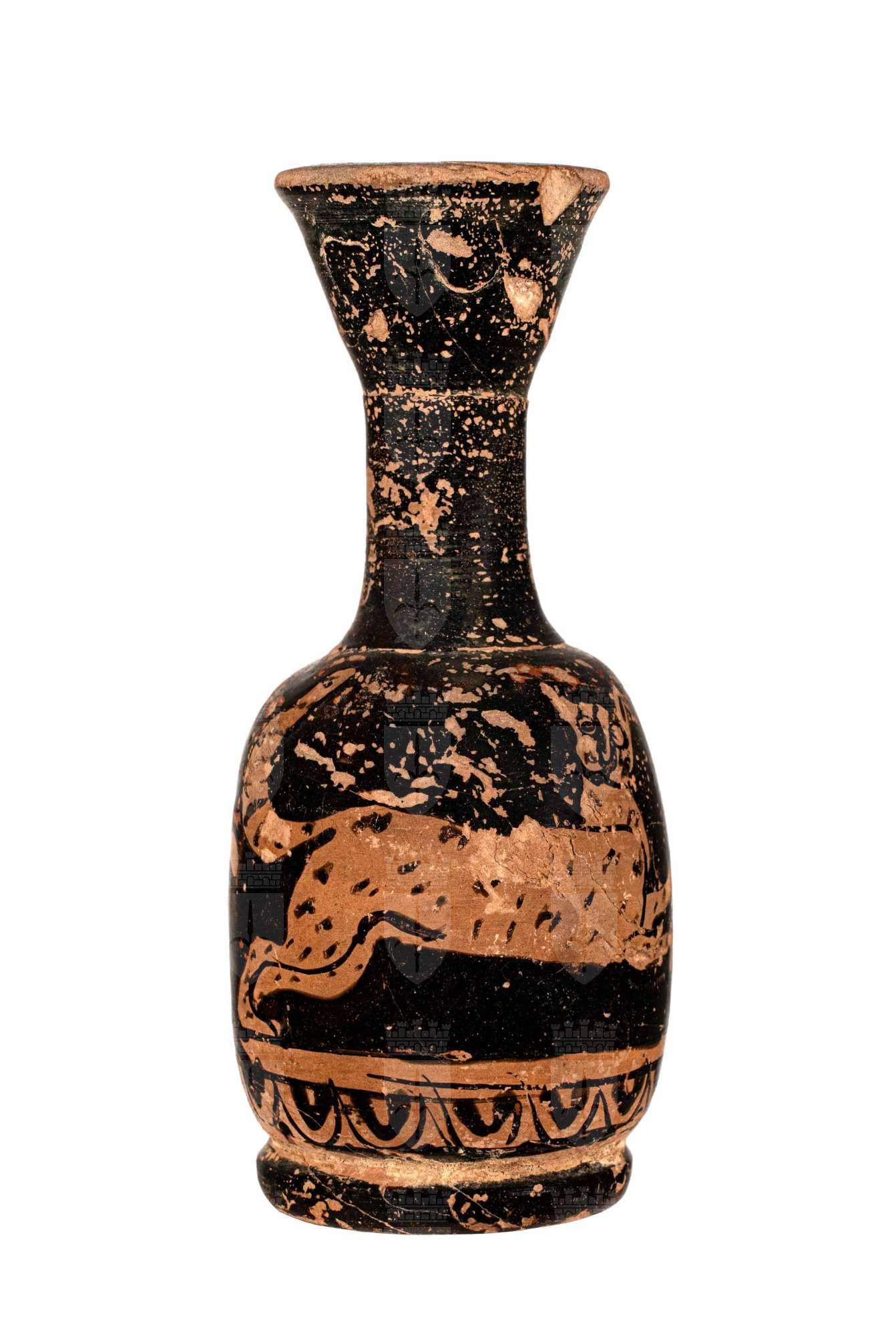Lekythos attica a figure rosse, palmetta sotto l'ansa e felino in corsa.