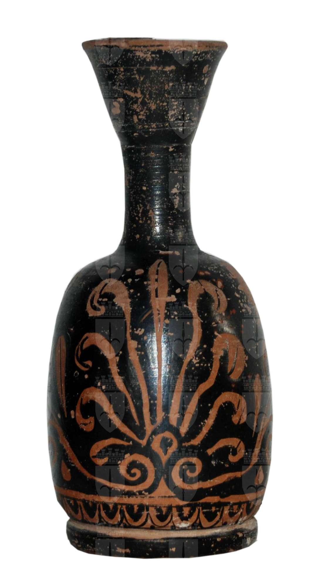 Lekythos aryballico a figure rosse con largo bocchello distinto, svasato, con labbro leggermente estroflesso. Collo dal profilo leggermente concavo. Lato A: palmetta tra girali con coppia di colombe. Palmetta costituita da 8 foglie con linea nera mediana e con parte terminale falcata; centralmente, foglia arrotondata all’estremità. Al centro calice romboidale con contorno a risparmio e campito centralmente in nero su coppia di foglie spiraliformi ai lati di un triangolo a risparmio. La palmetta è contornata lateralmente da due elementi vegetali con coppia di foglie spiraliformi con linea mediana nera con infiorescenza centrale a più petali e foglie ovate. Al di sopra di ciascun ramoscello, colomba in volo di profilo verso il centro rimangono evidenti i tratti a vernice nera del piumaggio su ali e coda; zampe abbassate, come per atterrare e appoggiarsi alla foglia sottostante.