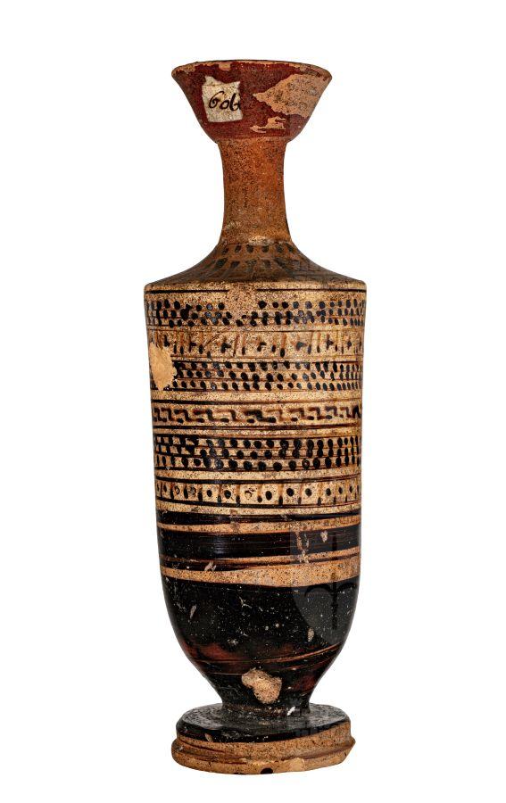 Lekythos attica a figure nere con motivo su tre fasce di di crocette, meandri e puntini separate tra loro da file di piccoli puntini; piede e basso ventre verniciato di nero.