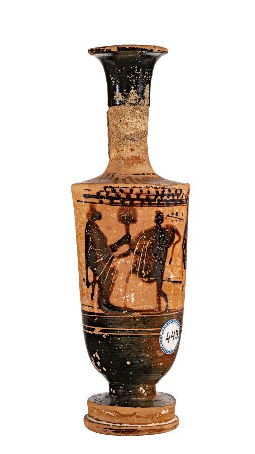 Lekythos attica a figure nere con graffito. Simposio: Sono rappresentate due coppie di giovani, poste una accanto all’altra. Le figure femminili, che hanno i capelli raccolti, si trovano rispettivamente a sinistra e sono rivolte verso il loro compagno, che sta in piedi davanti a loro. Sono sedute su un diphros ed indossano un chitone ed un himation drappeggiato, con entrambe le mani sostengono uno specchio. I giovani indossano una corta clamide e si appoggiano ad un bastone, mentre si specchiano. Sullo sfondo corrono tralci con foglie a puntini. Il graffito, molto sommario, indica solo i drappeggi delle vesti.