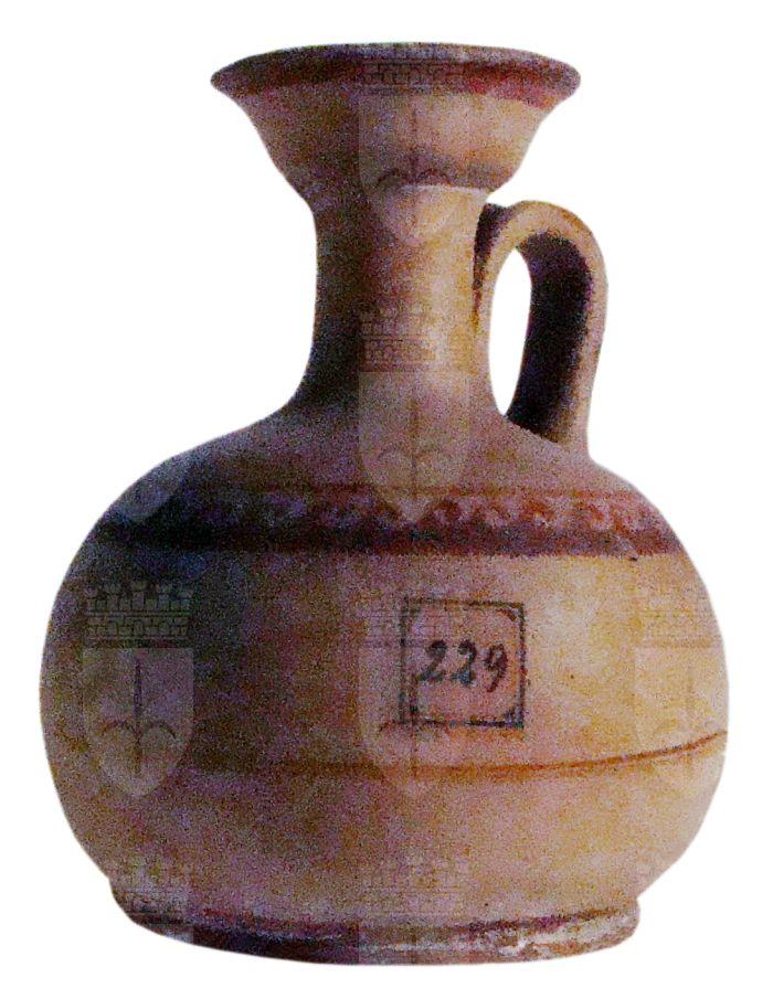 Lekythos ariballica. Bocchello troncoconico rovesciato, con collo cilindrico breve e corpo globulare schiacciato, piede ad anello, con ansa a nastro impostata verticalmente tra il collo e la spalla. Decorazione monocroma in rosso con fascia sotto l’orlo, motivo a onde in corrispondenza della spalla e fascia sottile a metà del ventre; campiti il labbro, l’ansa e il piede.