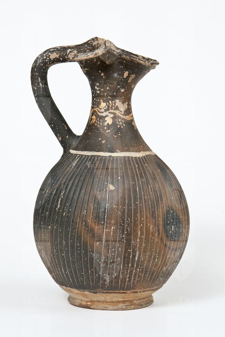 Oinochoe a vernice nera, tendente al bruno, con sovraddipinture in bianco e giallo. Labbro modanato, orlo estroflesso e trilobato, stretto collo a profilo concavo, corpo globulare strigilato espanso, ansa a bastoncello leggermente obliqua, desinente alla sommità, nel punto d’attacco all’orlo, in una protome ferina, piede ad anello. Sul collo: tralcio di edera con stelo ondulato dipinto e rosette di punti; alla base del collo, linea incisa e campita in bianco crema.