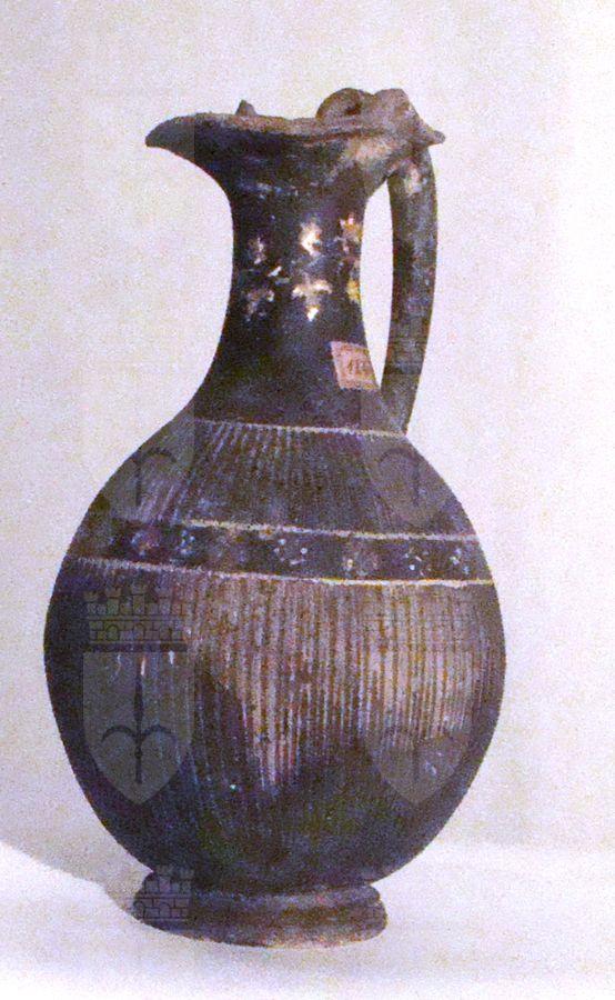 Oinochoe a vernice nera con sovraddipinture in bianco e giallo. Labbro modanato, orlo estroflesso e trilobato, stretto collo a profilo concavo, corpo globulare strigilato, con fascia liscia tra le strigilature, ansa a bastoncello verticale desinente alla sommità, nel punto d’attacco all’orlo, in una protome leonina, bassa gola di raccordo, basso piede troncoconico modanato. Sul collo: tralcio di vite in giallo, da cui pende un tralcio di edera con stelo sinuoso dipinto verticale. Una linea dipinta in bianco delimita superiormente il corpo strigilato. Sulla fascia liscia tra le strigilature, evidenziata da una coppia di linee dipinte in bianco, sequenza di rosette di punti, alternate a croci e foglia di edera in giallo.