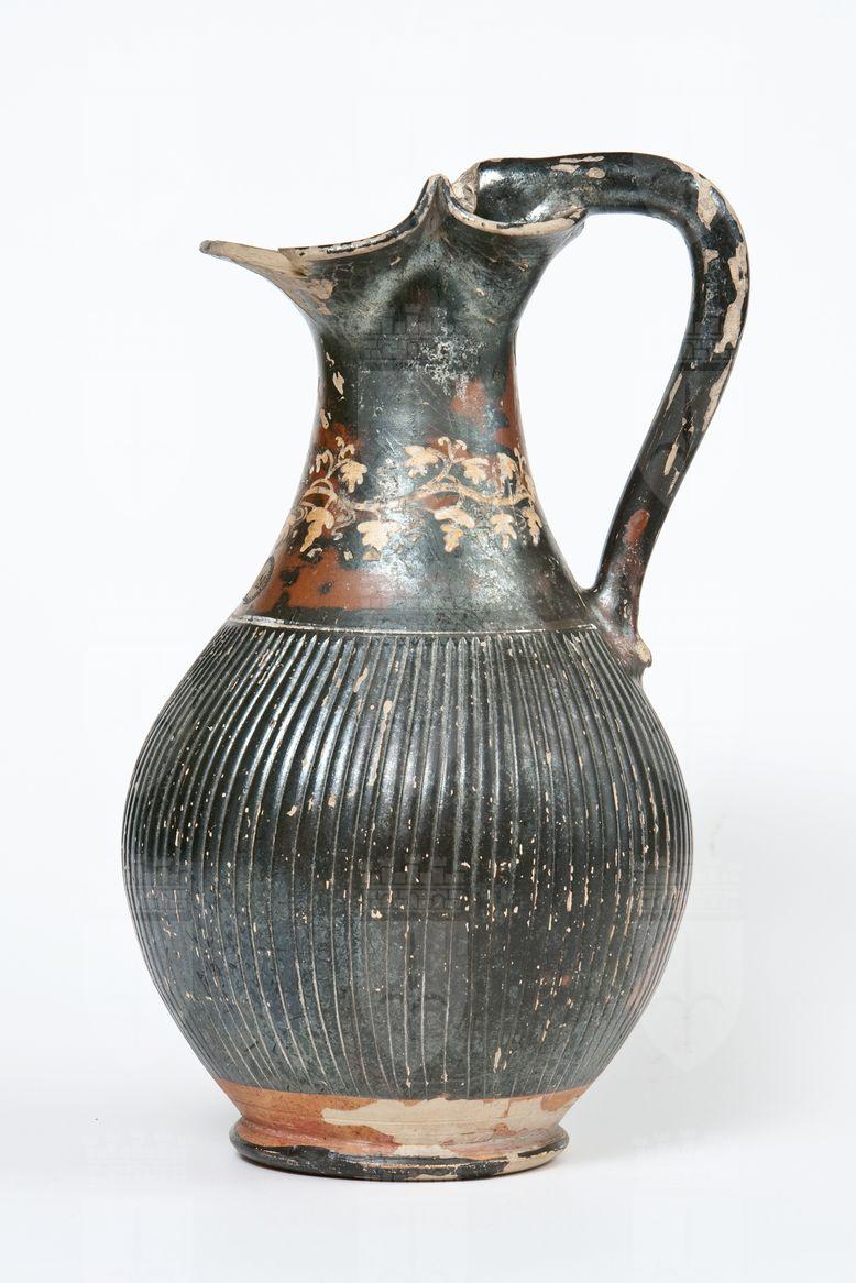 Oinochoe a vernice nera, tendente al rosso, con sovraddipinture in bianco e giallo. Orlo estroflesso e trilobato, collo a profilo concavo, corpo globulare strigilato, ansa a bastoncello leggermente obliqua e desinente alla sommità. nel punto d’attacco all’orlo, in una protome leonina, piede ad anello. Sul collo: tralcio di vite in giallo. Una linea dipinta in bianco, inquadra superiormente il corpo strigilato. Tracce di sovraddipintura sono presenti sulla protome leonina.