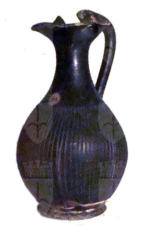 Oinochoe a corpo baccellato con attacco d'ansa a testa di animale, vernice nera priva di sovraddipintura