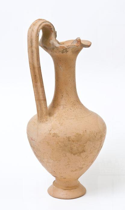 Oinochoe trilobata. Lungo collo leggermente svasato, corpo ovoidale, spalla a profilo convesso, alta ansa a nastro costolata, sormontante, impostata tra la bocca e la spalla; piede a echino modanato. Tracce di vernice rossa in corrispondenza dell’orlo e dell’ansa.