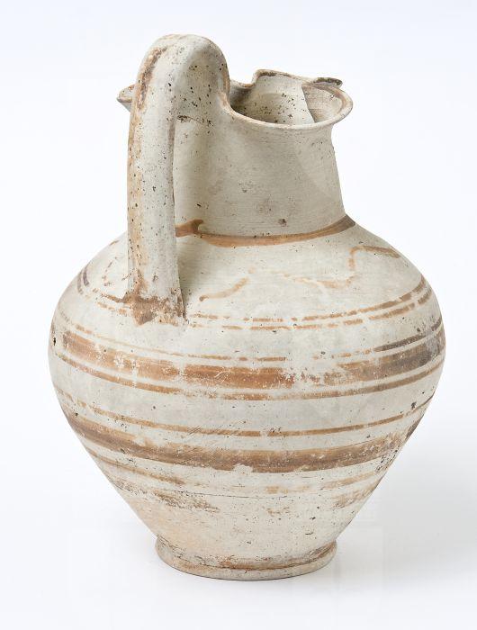 Oinochoe trilobata decorata a fasce si produzione peuceta. Collo corto, spalla carenata, corpo ovoidale, ansa a nastro sormontante impostata dalla bocca al di sotto della spalla, piede a disco. Decorazione monocroma in bruno: sul corpo, coppie di fasce sottili in bruno, orizzontali e parallele, tra cui si inserisce una fascia più larga marrone. Fascia sul collarino alla base del collo; coppia di grosse virgole in corrispondenza degli incavi del labbro che presenta l’orlo verniciato. Ansa e piede verniciati.