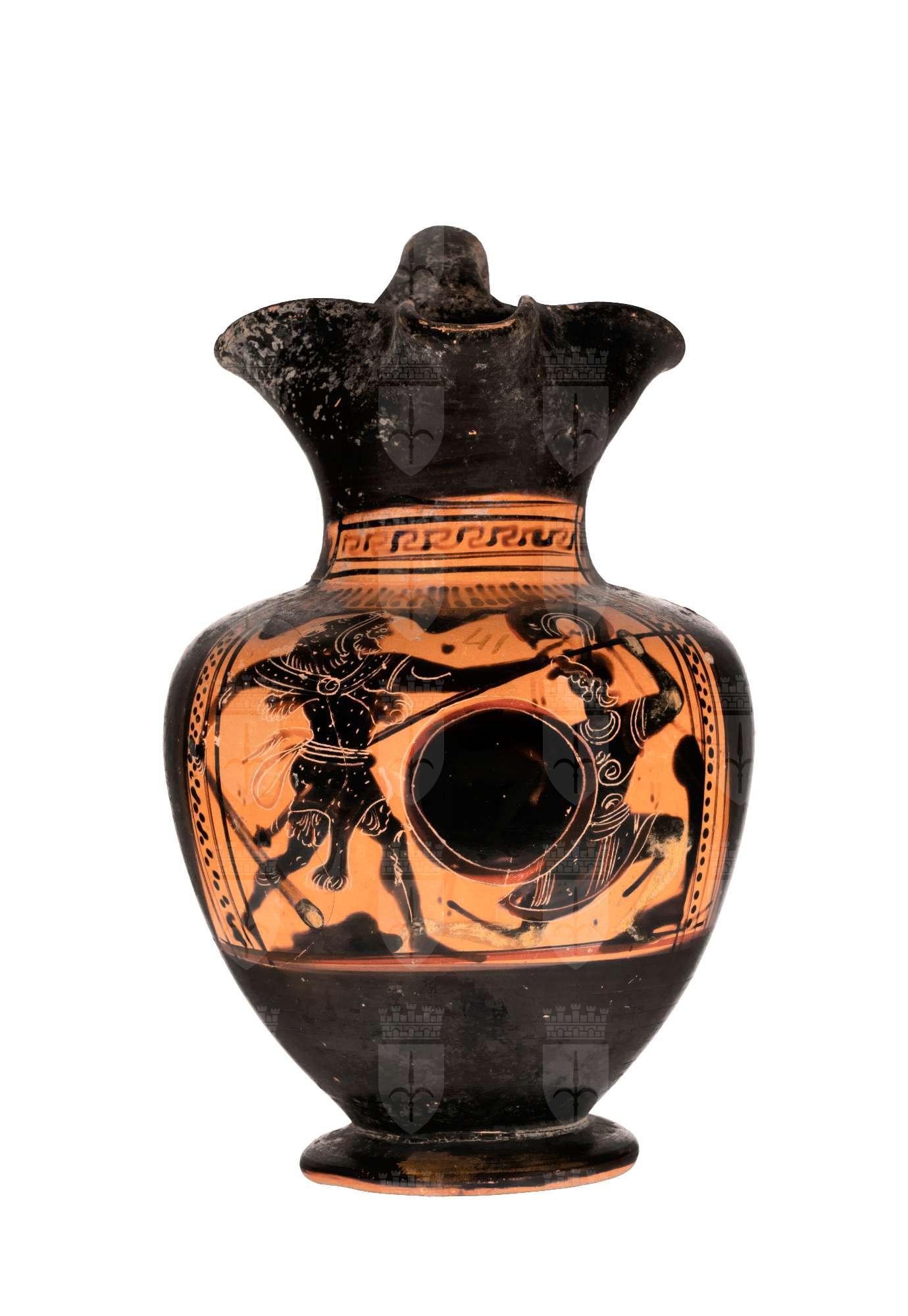 Oinochoe a figure nere con colori aggiunti e graffito: scena di Eracle che combatte contro una amazzone. Eracle, con indosso tunica, pelle di leone e schinieri, armato di clava aggredisce una amazzone, che piegata sul ginocchio sinistro, armata di elmo attico, corazza e schinieri, brandisce la lancia e uno scudo rotondo con al centro una gamba umana. Lo sfondo roccioso è reso a macchie indistinte.