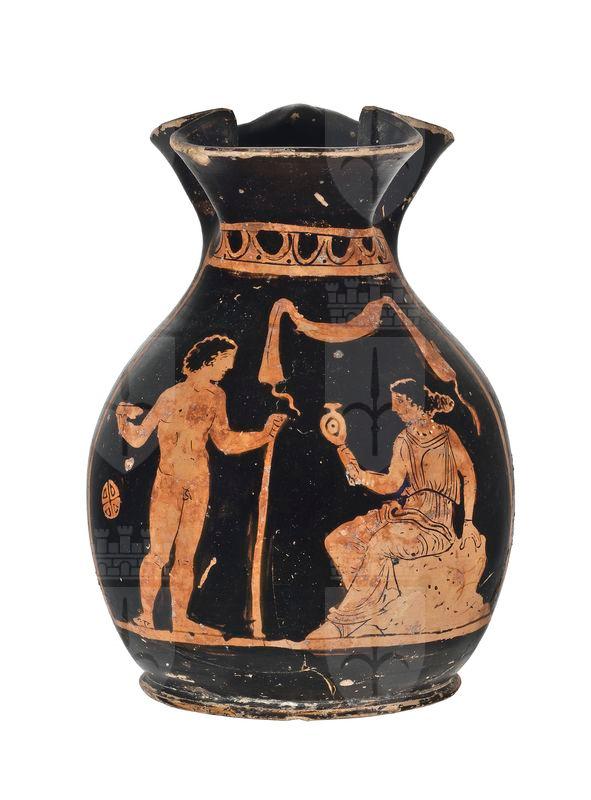 Oinochoe apula a figure rosse con ventre espanso e breve spalla. Entro un pannello: giovane stante nudo con coppa e bastone e donna seduta con specchio; palla a spicchi e benda sospesi in aria.