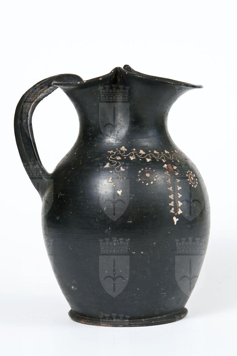 Oinochoe a vernice nera lucente con sovraddipinture in bianco, giallo e rosso/arancio ed incisioni. Orlo trilobato ed estroflesso, basso collo a profilo concavo, corpo ovoidale, ansa a nastro verticale desinente dalla sommità, nel punto d’attacco all’orlo, in una protuberanza, stilizzazione di una protome, basso piede ad anello. Sul corpo: tralcio d’edera a pergolato, con stelo sinuoso inciso e punti, da cui pendono due tralci d’edera verticali con stelo lineare dipinto in rosso amaranto e foglie cuoriformi in giallo su base bianca. Tra i tralci di edera verticali rosette di punti con bottone centrale in giallo inscritto in un cerchio rosso amaranto.