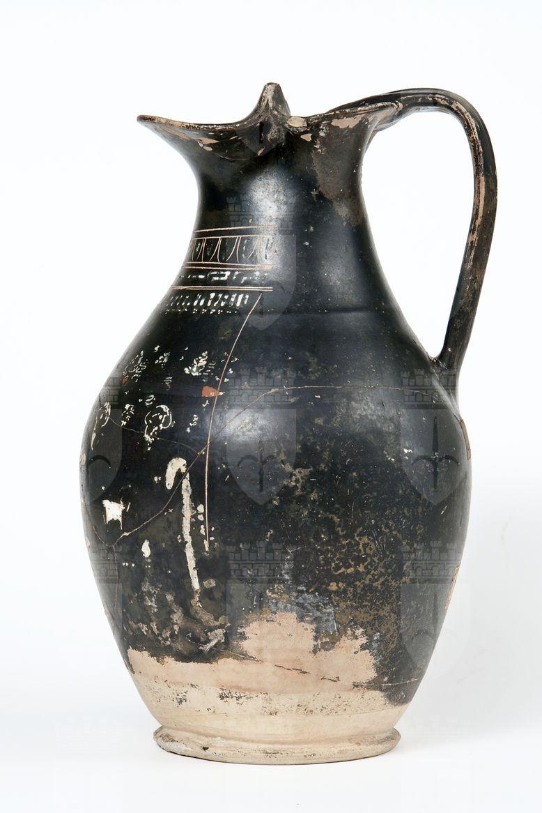 Oinochoe con due kantharoi a vernice nera con sovraddipinture in bianco, giallo e rosso ed incisioni. Orlo trilobato, largo collo a profilo concavo, corpo globulare espanso, ansa a nastro leggermente obliqua, basso piede ad anello. Sul collo: tra tre coppie di linee incise, sequenza di ovuli incisi e dipinti con punti in bianco, meandro, pendenti lunghi campiti su gruppi di tre punti in bianco. Sul corpo: inquadrato da due rami secchi dei quali sono rimasti visibili solo gli steli incisi e qualche punto, tralcio di vite a pergolato, sotto il quale sono due kantharoi, su fila di punti in bianco, divisi dal tralcio di vite ed affiancati alle loro estremità laterali da due bende pendenti.