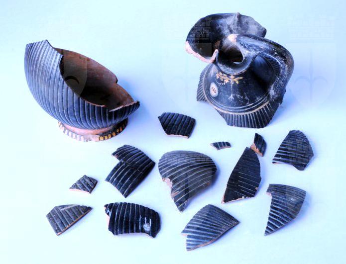Oinochoe con attacco d'ansa a testa di capra (o pecora? Non leggibile); vernice nera sovraddipinta; sul collo pende da una tenia appesa ad una ghirlanda d'edera in corimbi una larva femminile con capelli avvolti nella mitella. In frammenti, da restaurare.