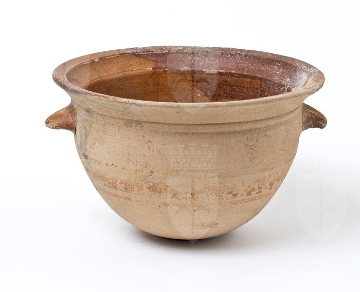 Olla con corpo globoso, rastremato sul fondo. Base piana priva di piede, con labbro svasato e orlo appiattito, distinto dal corpo con una risega, con prese laterali impostate orizzontalmente sotto l’orlo e rivolte verso il basso. Decorazione in vernice rossa diluita su fondo chiaro: sul corpo, fascia centrale più ampia, inquadrata in alto e in basso tra due fasce più sottili; dipinti l’orlo e le anse.