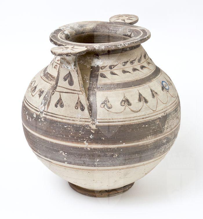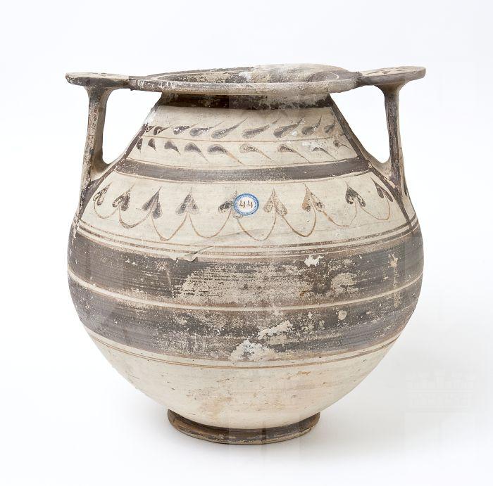 Olla in ceramica messapica con due anse verticali in forma di scalpello unite al labbro mediante rotella. Basso collo troncoconico a profilo convesso, corpo globoso, piede a disco. Decorazione monocroma in bruno su fondo di argilla naturale, su entrambi i lati: sul collo, riquadro con ramo di foglie lanceolate; sulla spalla, foglie lobate unite da archetti su un lato, serti con foglie d’edera sull’altro; sul ventre, fasce di colore bruno; sulle rotelle, giro di foglie uscenti dal centro di esse; sulle anse, due riquadri separati da doppie linee parallele, con serti d’edera; orlo e piede interamente dipinti.