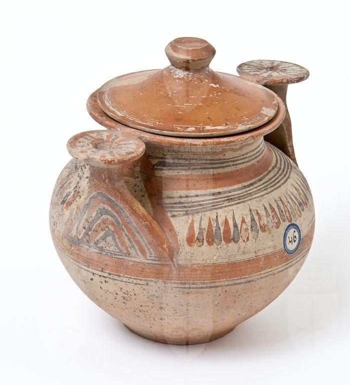 Olla con coperchio in ceramica messapica. Anse verticali in forma di scalpello unite al labbro mediante rotella, basso collo troncoconico a profilo convesso, corpo biconico, apoda a base piana. Decorazione bicroma in rosso e bruno su fondo di argilla naturale. Su entrambi i lati, sul collo, riquadro con motivo a tremulo e linee parallele; sulla spalla, riquadro con linee parallele e fascia di foglie lobate brune e rosse alternate; sul ventre, fascia rossa e linee brune; sulle rotelle, dipinte in rosso, giro di foglie in chiaro uscenti dal centro di esse, incavato; orlo e base interamente dipinti. Coperchio con pomello a sezione biconica, con estremità piatta.