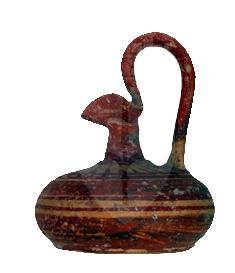 Olpe miniaturistica con ventre globulare compresso, collo stretto, bocca trilobata ed alta ansa verticale sopraelevata a nastro; decorazione a fasce e raggiera.
