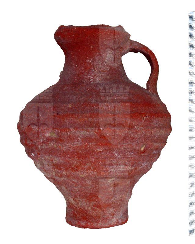 Piccola olpe n argilla grezza con piede leggermente allargato, corpo biconico decorato da scanalature sul ventre e con una piccola ansa a nastro; orlo leggermente proteso a formare un beccuccio.