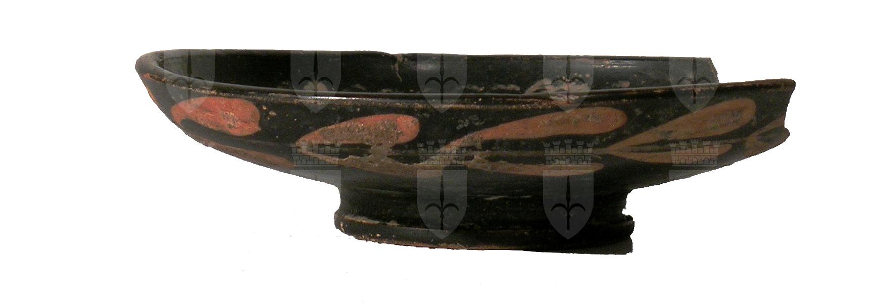 Patera con serto di alloro lungo l'esterno. All'interno due zone a serpentelli e a lineette verticali, un giro di viticci e nel mezzo una palmetta con l'ombelico in rilievo.