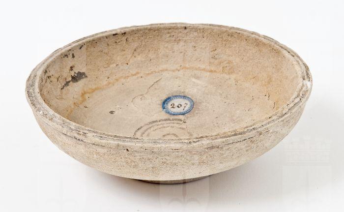 Coppa con vasca profonda, a profilo convesso. Fondo concavo e profilo indistinto, piede ad anello. Decorazione in rosso diluito su fondo acromo: all’interno, cerchi concentrici sul fondo; all’esterno, interamente acroma.