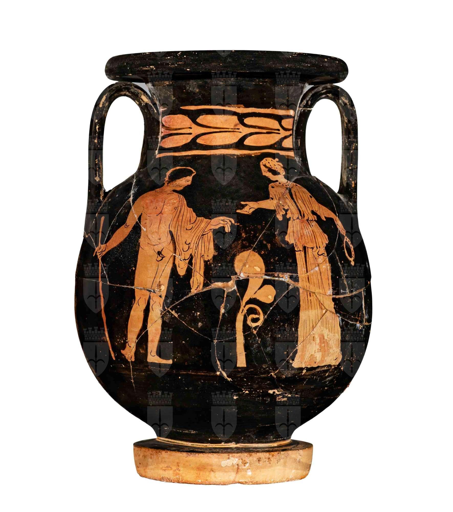 Pelike apula a figure rosse. Lato A: giovane nudo con bastone, figura femminile con serto. Lato B: due figure maschili ammantate.