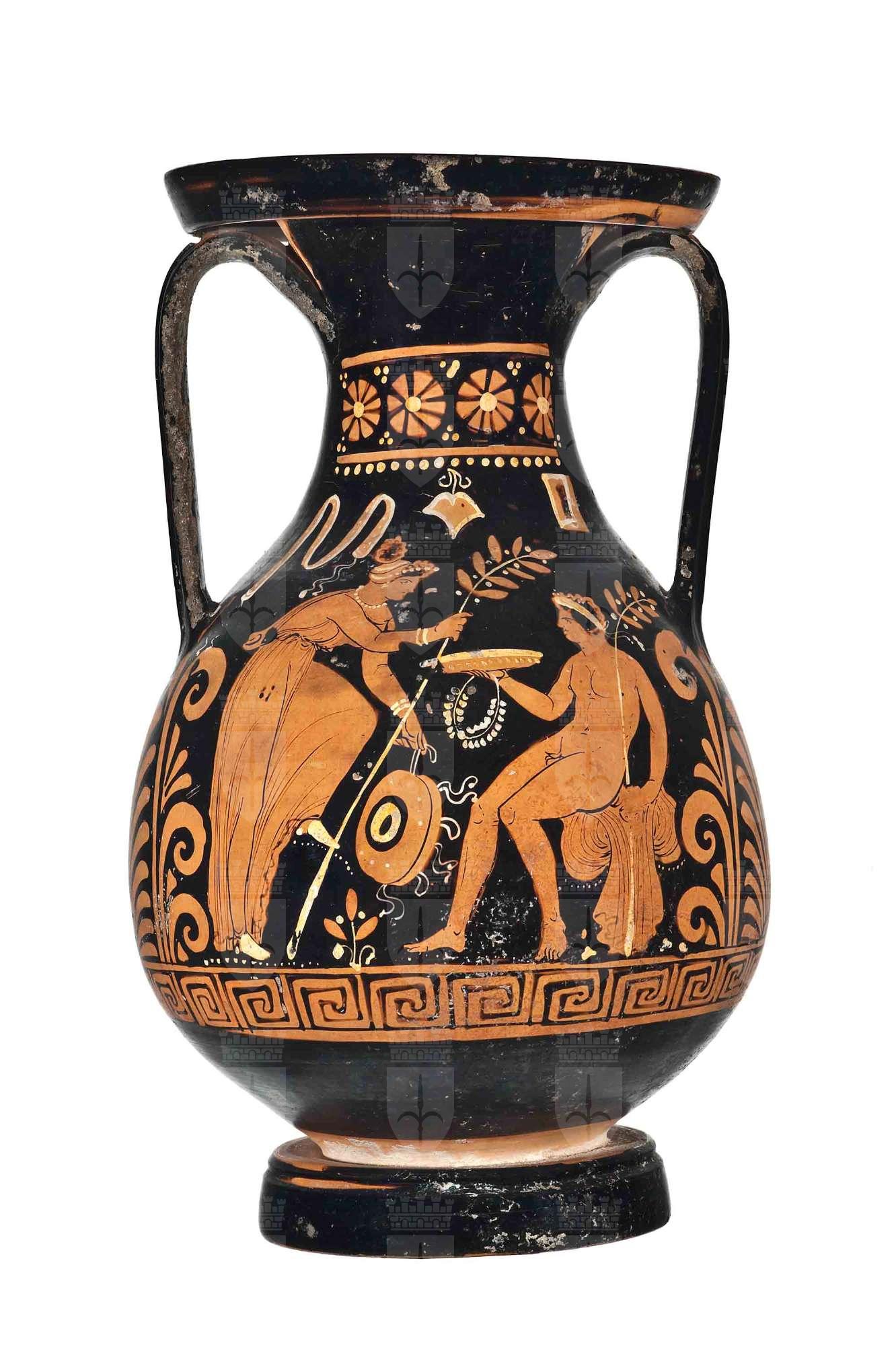 Pelike apula a figure rosse, palmette sotto le anse. Lato A: figura femminile vestita di chitone con timpano e tirso, dettagli in bianco: efebo nudo seduto con tirso e patera con serto. Lato B: due giovani ammantati con bastone.