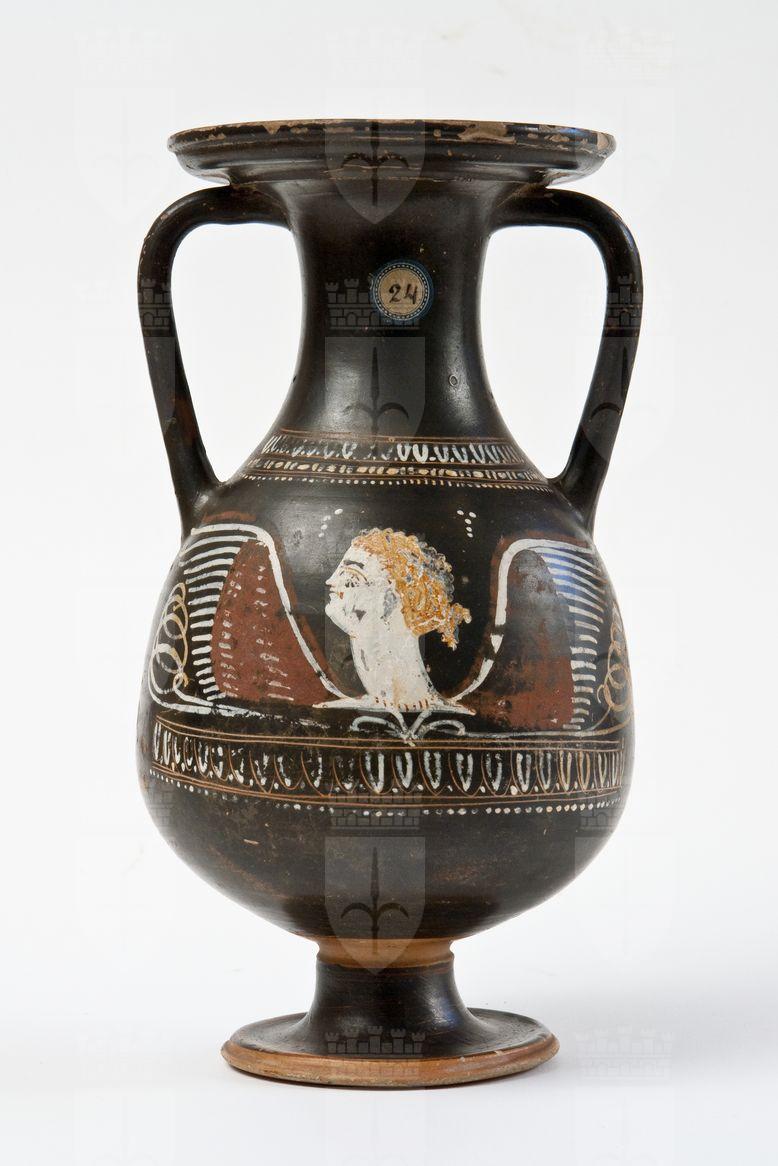 Pelike a vernice nera, a tratti tendente al rosso, con sovraddipinture in bianco, giallo e rosso amaranto ed incisioni. Labbro revoluto, orlo estroflesso e modanato, stretto collo a profilo concavo, corpo globulare rastremato verso l’alto, anse a bastoncello oblique, piede campanulato con taglio modanato. A: Alla base del collo, tra tre coppie di linee incise sequenza di ovuli, dipinti con punti in bianco, astragali e fila di punti in giallo; sul corpo erote alato, di profilo verso sinistra: soltanto la testa, dipinta in bianco crema con dettagli in giallo, tra due ali, decorate di rosso amaranto e rifinite in bianco e giallo, nascente da un fiore campanulato, in bianco, e tra complessi di girali, in giallo. Alla base del corpo: sequenza di ovuli incisi e dipinti con punti, tra due coppie di linee incise, ed infine fila di punti bianchi. B: Rosetta con bottone centrale e petali triangolari campiti in giallo su base bianca, inquadrata da due rami secchi, con stelo inciso, pendenti e ricurvi verso l’esterno.