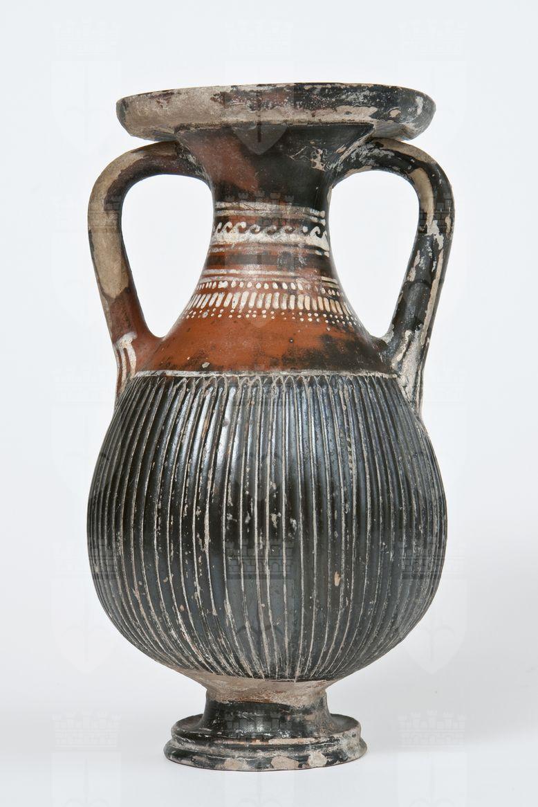 Pelike a vernice nera, a tratti tendente al rosso, con sovraddipinture in bianco, giallo e rosso amaranto. Labbro a tesa, orlo estroflesso leggermente revoluto, collo a profilo concavo, corpo globulare, baccellato e rastremato verso l’alto, anse a bastoncello leggermente oblique e adiacenti all’orlo, bassa gola di raccordo, piede troncoconico modanato, fondo leggermente apicato. A e B: Tra una coppia di linee ed una linea in bianco-giallo, onda destrosa dipinta in giallo su base bianca; seguono: una fascia in rosso amaranto (rimangono le tracce in negativo del pigmento); una coppia di linee; una fila di punti; infine una sequenza di pendenti lungo campiti; il tutto dipinto in giallo su base bianca. Una linea dipinta in bianco inquadra superiormente il corpo baccellato. Le anse, in prossimità dell’attacco inferiore, sono decorate con una linea orizzontale da cui pendono bastoncelli verticali.