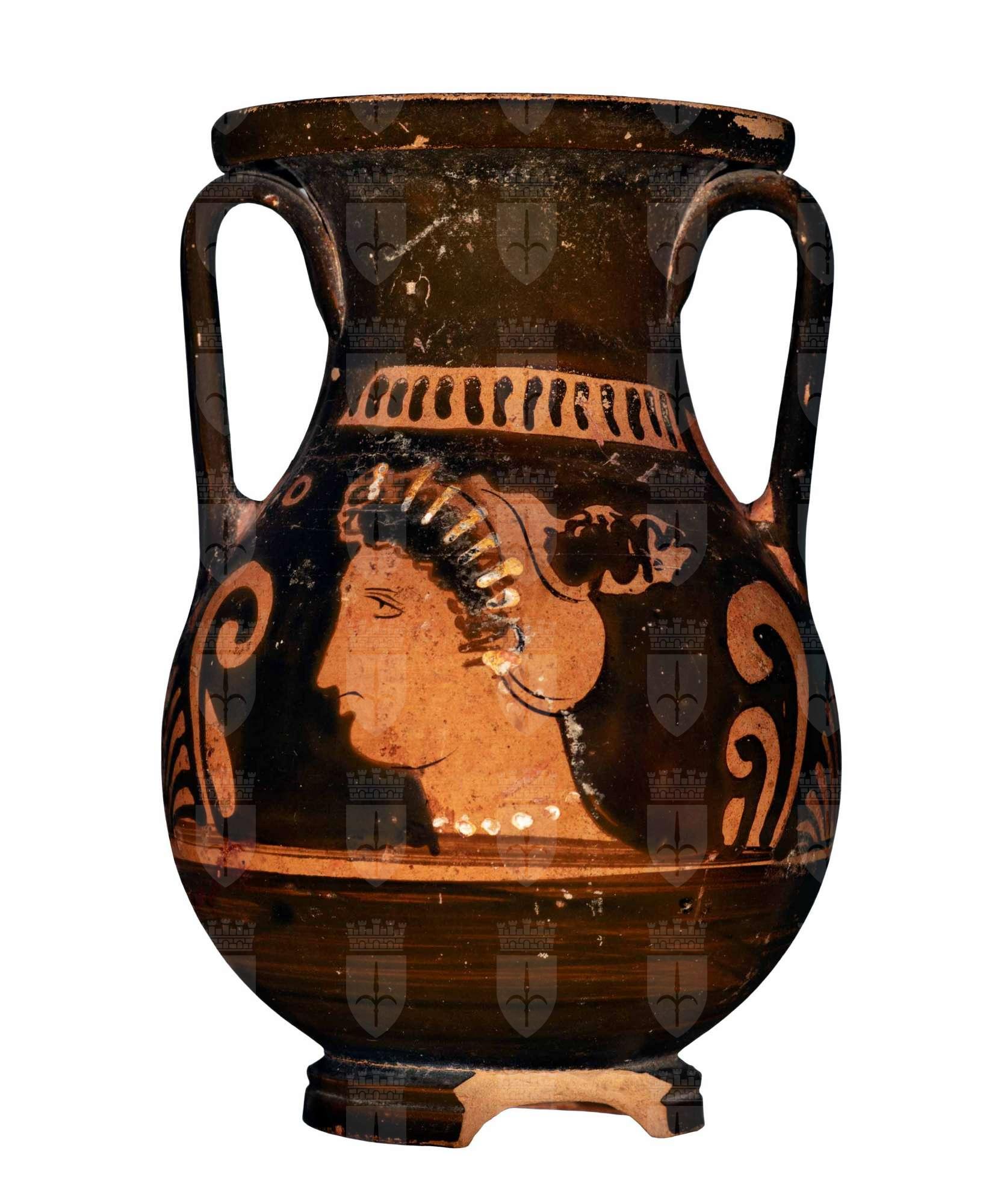 Orlo revoluto su collo a profilo concavo; spalla obliqua; corpo ovoide, distinto da una sottile linea graffita; anse verticali a nastro con lievissima costolatura mediana, impostate tra collo e spalla; Lato A: testa femminile con stephanè Testa femminile di profilo rivolta verso sinistra. Fronte e naso costituiti da un’unica linea continua; mezzo di una breve linea a vernice nera tendente verso il basso. Il mentoè abbastanza stondato. Un sakkòs, decorato sulla nuca con una corona di linguette e lungo la circonferenza da una doppia linea continua a vernice nera diluita e da una fila di pallini in vernice nera, copre i capelli, di cui fuoriesce solo una ciocca di riccioli neri all’altezza dell’orecchio. Al sakkòs è sovrapposta una stephanè ad alti raggi in bianco e giallo sovradipinto; indossa collana ad unico filo di vaghi circolari sovradipinti in bianco (in parte evanidi) e orecchini a rosetta costituiti da tre vaghi circolari accostati, in bianco e giallo sovradipinto. Nel campo, ai due lati della testa femminile, in alto, due rosette quadripetale Lato B: testa femminile con stephanè, il disegno rimanda lo stesso del lato A.