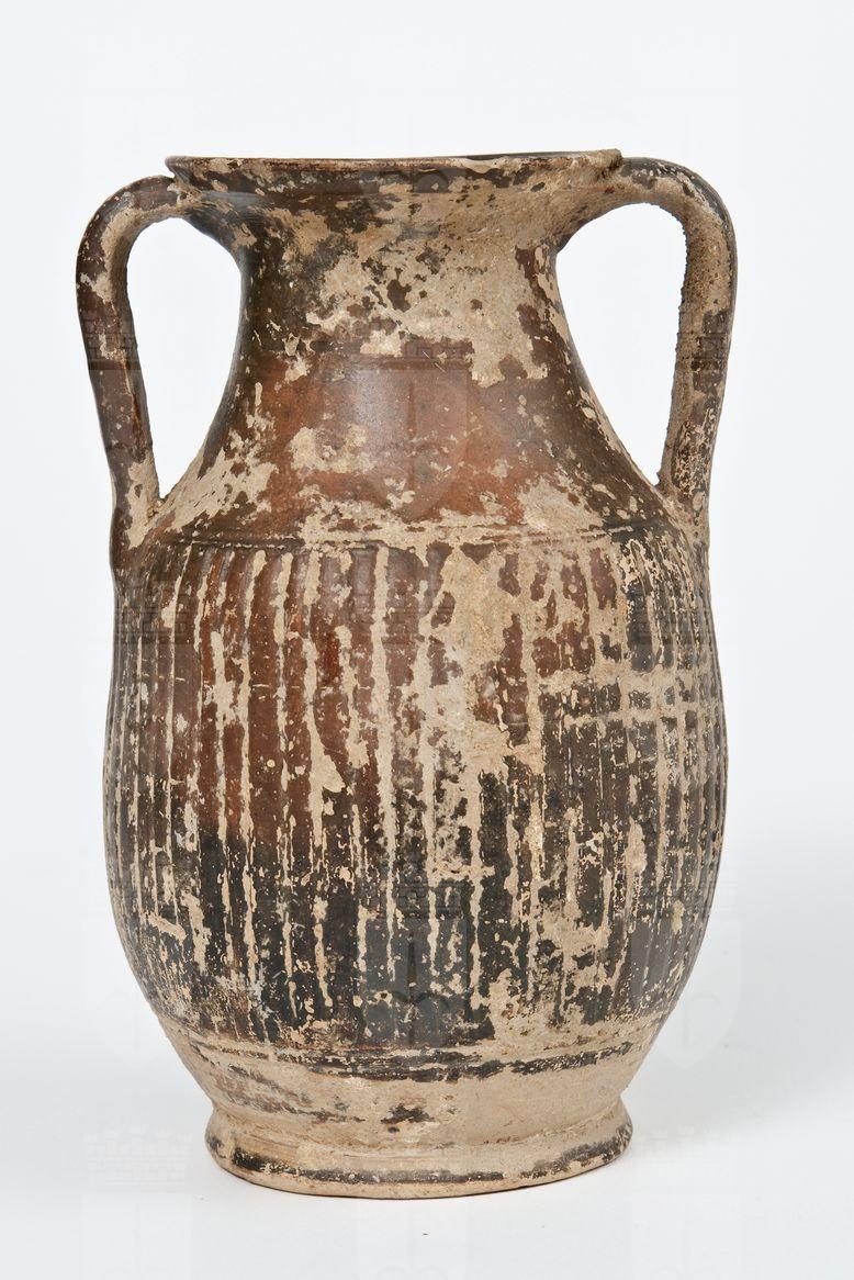 Pelike a vernice nera, tendente al rosso-bruno, sovraddipinta. Labbro leggermente revoluto, orlo estroflesso, corpo globulare strigilato, modanato alle estremità, anse a nastro verticali, piede ad anello. Le tracce in negativo di un’ipotetica onda è quanto rimane della decorazione.