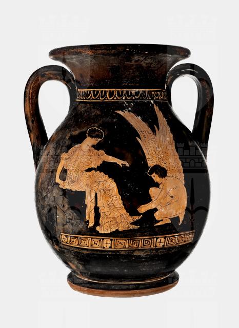 Pelike a figure rosse. Lato A: Eros allaccia il sandalo ad una fanciulla in lungo chitone seduta. Lato B: Un giovane ammantato con lungo bastone nella destra.
