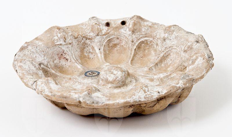 Phiale mesonfalica baccellata apula argentata. Bassa vasca emisferica, orlo ondulato ed estroflesso. All’interno, pomello rilevato al centro, baccellature concave profilate da un bordo incavato, tra le quali si dispongono, in corrispondenza dell’orlo, testine in rilievo; su un lato dell’orlo, due fori per la sospensione. La phiale presenta una spessa ingubbiatura biancastra di caolino a imitazione dei prototipi argentei.